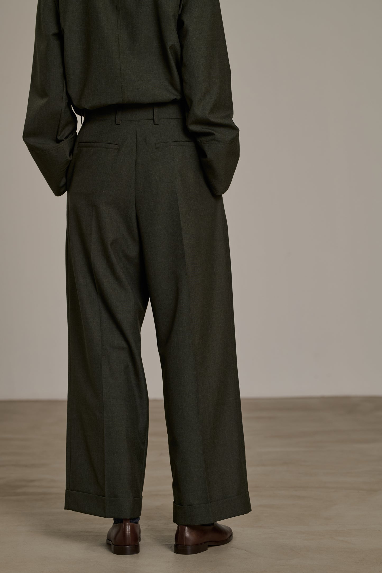 Pleated trousers in speckled wool canvas khaki