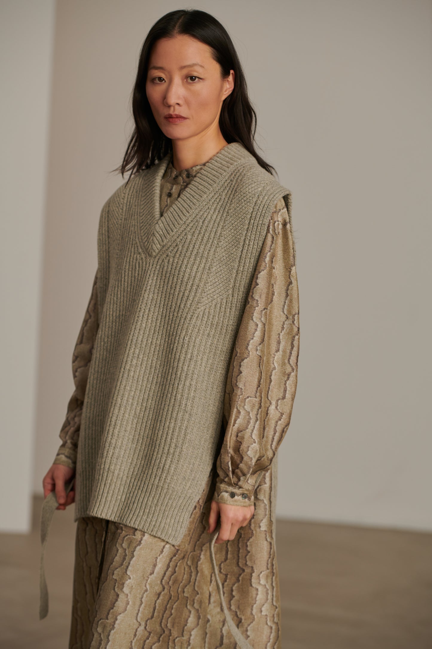 COSTA is a straight bib, knitted in virgin wool yarn. Visual impact is created by a ribbed effect, with ties on the sides that can be worn belted to accentuate the waist or left to hang. This piece is ideal for adding warmth to an outfit, such as a silk dress or a cotton shirt.